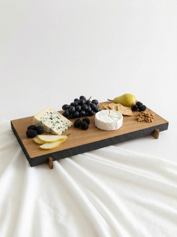 Dębowa deska do serwowania z ryflowanymi, opalanymi brzegami i subtelnymi nóżkami. Połączenie funkcjonalności i wyjątkowych detali sprawia, że staje się elegancką ozdobą stołu. Idealna do serów, wędlin i przekąsek. Wymiary: 30 × 16 × 3 cm. Każdy egzemplarz ma unikalne usłojenie.