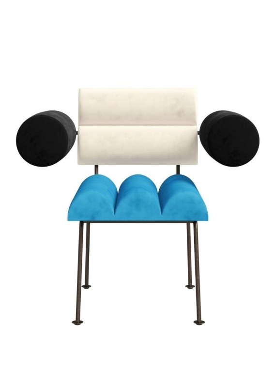 Designerski fotel z podłokietnikami z kolekcji ROLL&ROLL autorstwa Katarzyny Jasyk. Łączy nowoczesny design z wygodą użytkowania. Tapicerowany ekskluzywną tkaniną velvetową i osadzony na stabilnej metalowej podstawie. Idealny do jadalni, salonu oraz przestrzeni publicznych.