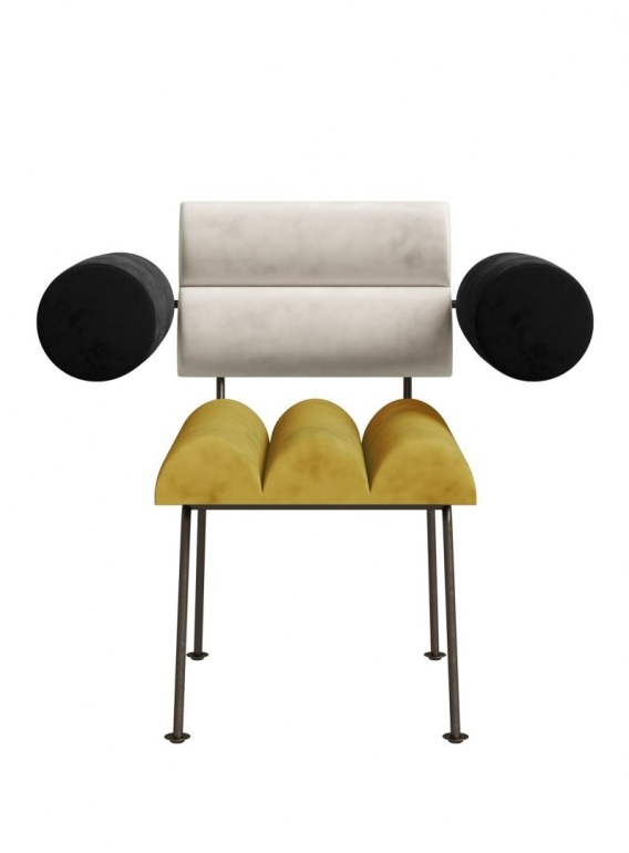 Designerski fotel z podłokietnikami z kolekcji ROLL&ROLL autorstwa Katarzyny Jasyk. Łączy nowoczesny design z wygodą użytkowania. Tapicerowany ekskluzywną tkaniną velvetową i osadzony na stabilnej metalowej podstawie. Idealny do jadalni, salonu oraz przestrzeni publicznych.