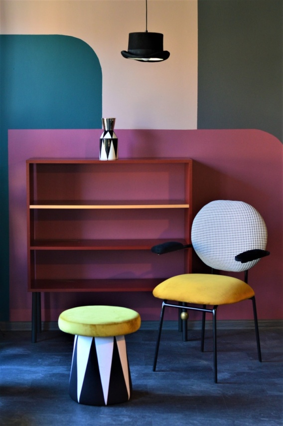 Oryginalny fotel tapicerowany na metalowej podstawie, którego forma inspirowana jest wzornictwem lat 70. Charakterystyczna sylwetka oraz wyraziste zestawienie kolorów sprawiają, że mebel staje się wyjątkowym elementem aranżacji wnętrza.