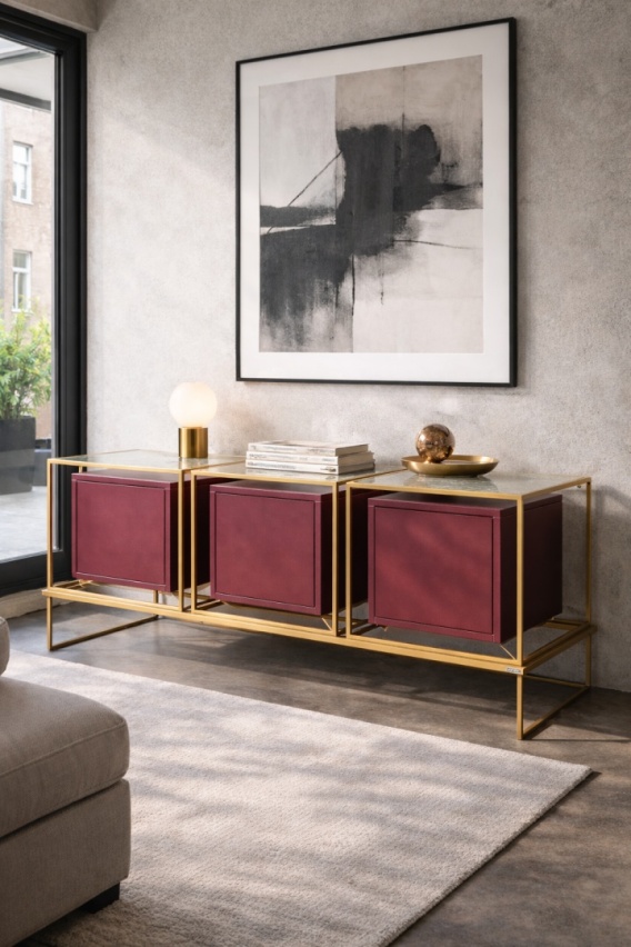 Trzy sześcienne moduły zawieszone w czarnej metalowej ramie tworzą efekt lewitujących brył, dzięki czemu komoda prezentuje się lekko i nowocześnie. To właśnie zestawienie prostych linii, dopracowanych proporcji i wysokiej jakości materiałów wyróżnia model COMO Plus na tle masowej produkcji.