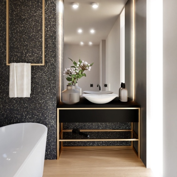 Konsola łazienkowa 60×40×75 cm to nowoczesna alternatywa dla szafki podumywalkowej. Stabilna, w całości spawana stalowa konstrukcja z odporną na wilgoć płytą akrylową i szklaną półką zapewnia trwałość oraz funkcjonalność. Idealna do wnętrz glamour, nowoczesnych i art déco.