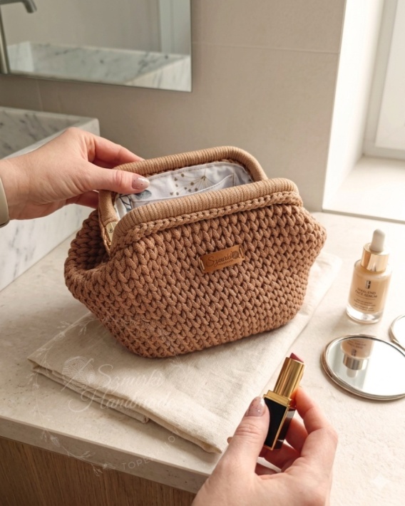 Ta kosmetyczka to połączenie wygody, pojemności i estetycznego wyglądu. Została wykonana z lekkiego, a jednocześnie wytrzymałego sznurka poliestrowego, dzięki czemu świetnie sprawdza się w codziennym użytkowaniu i łatwo utrzymać ją w czystości.