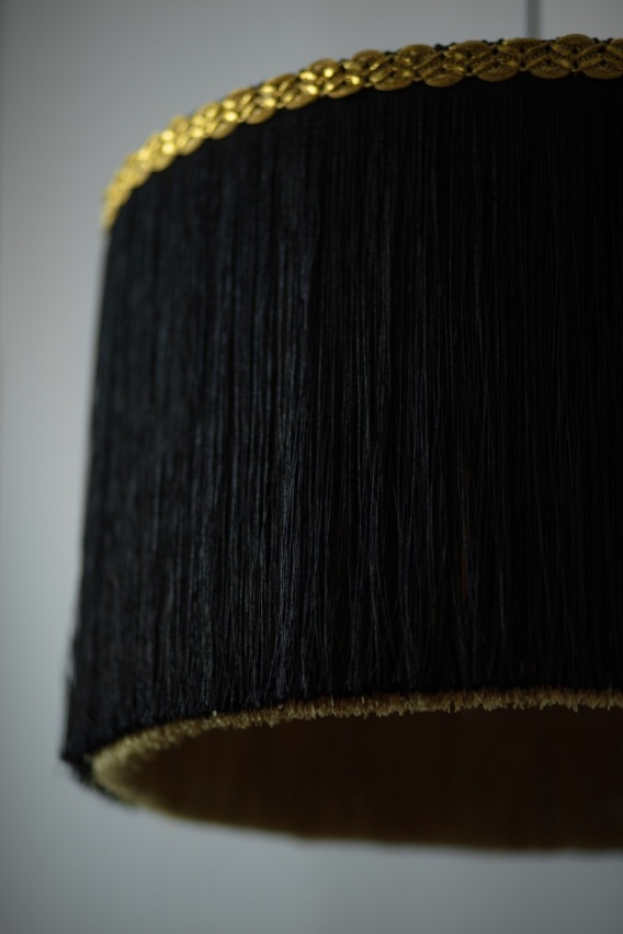 Kontrast czerni i złota w połączeniu z długimi, 30-centymetrowymi frędzlami tworzy dynamiczną, a zarazem elegancką kompozycję. Szerokość 450 mm sprawia, że lampa doskonale odnajdzie się w salonie, jadalni, sypialni czy przestrzeni komercyjnej, podkreślając charakter aranżacji.