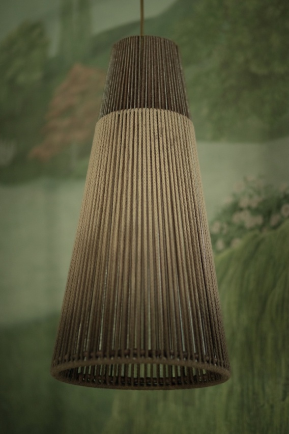 Lampa ZICHERKA 1 brązowa to ręcznie wykonana forma z włóczki, sznurka tekstylnego i drewnianych koralików. Smukły kształt (wys. 50 cm, szer. 25 cm) nadaje jej lekkości i naturalnego charakteru. Przystosowana do jednej żarówki E27 (max. 40 W).