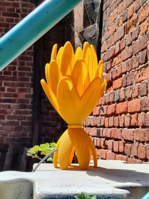 Lampka wykonywana jest z filamentu PLA, materiału najczęściej produkowanego ze skrobi kukurydzianej lub innych surowców pochodzenia roślinnego.