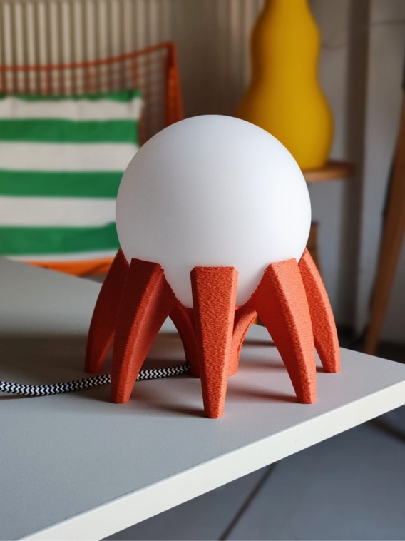Model został wyposażony w matowy, szklany klosz, który delikatnie rozprasza światło i nadaje lampce przytulny charakter. Nogi wykonane są jako pojedynczy wydruk 3D, co pozwala zachować lekką formę, stabilność i atrakcyjną cenę projektu.