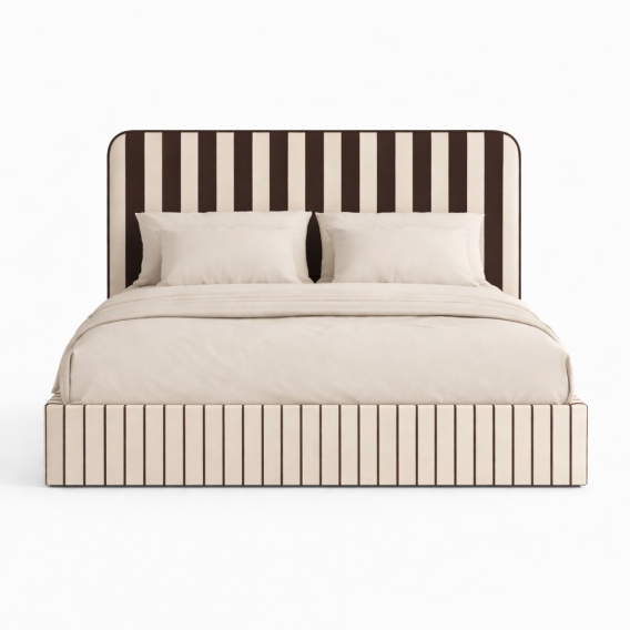 Łóżko wykonane jest z wysokiej jakości drukowanej tkaniny velvet, która nadaje bryle miękkość, głębię koloru oraz elegancki charakter. Tapicerowany zagłówek o grubości 5 cm zapewnia komfort podczas odpoczynku i pełni funkcję dekoracyjną, stanowiąc wyrazisty, graficzny akcent we wnętrzu. Zagłówek jest osobnym elementem montowanym do ściany, co daje swobodę aranżacyjną i umożliwia dopasowanie do różnych typów łóżek oraz materacy. Skrzynia łóżka posiada burty łączone pod kątem prostym, co podkreśla geometryczny charakter projektu i nadaje bryle wyraźną, nowoczesną formę.