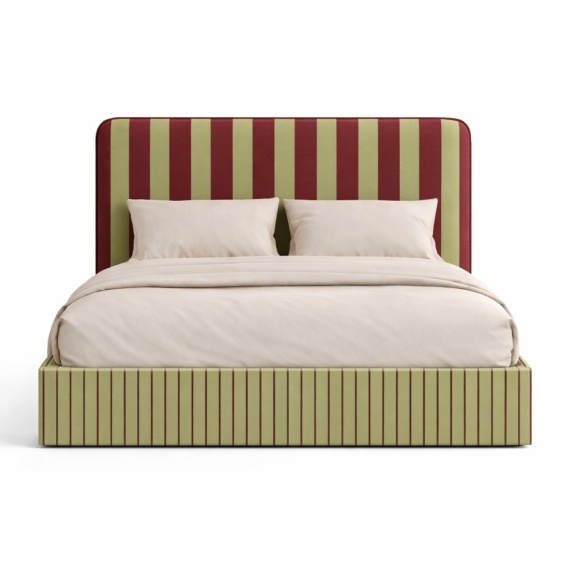 Łóżko wykonane jest z wysokiej jakości drukowanej tkaniny velvet, która nadaje bryle miękkość, głębię koloru oraz elegancki charakter. Tapicerowany zagłówek o grubości 5 cm zapewnia komfort podczas odpoczynku i pełni funkcję dekoracyjną, stanowiąc wyrazisty, graficzny akcent we wnętrzu. Zagłówek jest osobnym elementem montowanym do ściany, co daje swobodę aranżacyjną i umożliwia dopasowanie do różnych typów łóżek oraz materacy. Skrzynia łóżka posiada burty łączone pod kątem prostym, co podkreśla geometryczny charakter projektu i nadaje bryle wyraźną, nowoczesną formę.