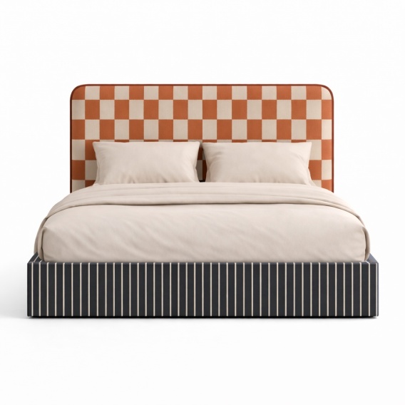 Łóżko wykonane jest z wysokiej jakości drukowanej tkaniny velvet, która nadaje bryle miękkość, głębię koloru oraz elegancki charakter. Tapicerowany zagłówek o grubości 5 cm zapewnia komfort podczas odpoczynku i pełni funkcję dekoracyjną, stanowiąc wyrazisty, graficzny akcent we wnętrzu. Zagłówek jest osobnym elementem montowanym do ściany, co daje swobodę aranżacyjną i umożliwia dopasowanie do różnych typów łóżek oraz materacy. Skrzynia łóżka posiada burty łączone pod kątem prostym, co podkreśla geometryczny charakter projektu i nadaje bryle wyraźną, nowoczesną formę.