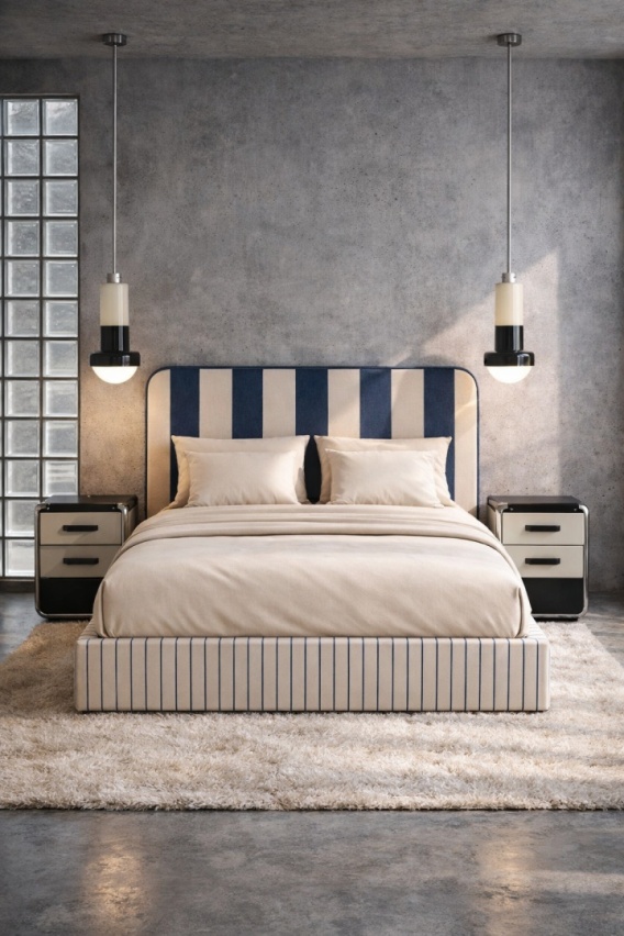 Łóżko wykonane jest z wysokiej jakości drukowanej tkaniny velvet, która nadaje bryle miękkość, głębię koloru oraz elegancki charakter. Tapicerowany zagłówek o grubości 5 cm zapewnia komfort podczas odpoczynku i pełni funkcję dekoracyjną, stanowiąc wyrazisty, graficzny akcent we wnętrzu. Zagłówek jest osobnym elementem montowanym do ściany, co daje swobodę aranżacyjną i umożliwia dopasowanie do różnych typów łóżek oraz materacy. Skrzynia łóżka posiada burty łączone pod kątem prostym, co podkreśla geometryczny charakter projektu i nadaje bryle wyraźną, nowoczesną formę.
