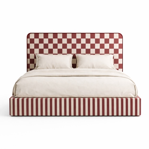 Łóżko tapicerowane DISSONANCE No.9 designerskie z zagłówkiem czerwono beżowe