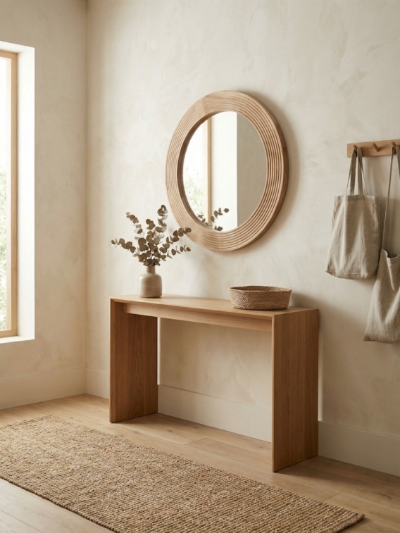 Lustro w ryflowanej ramie z drewna dębowego o eleganckim, falistym wzorze. Naturalny materiał i dekoracyjna forma sprawiają, że staje się wyjątkowym elementem wnętrza. Optycznie powiększa i rozjaśnia przestrzeń. Możliwość wybarwienia w kolorze z palety Rubio Monocoat. Średnica: 100 cm.