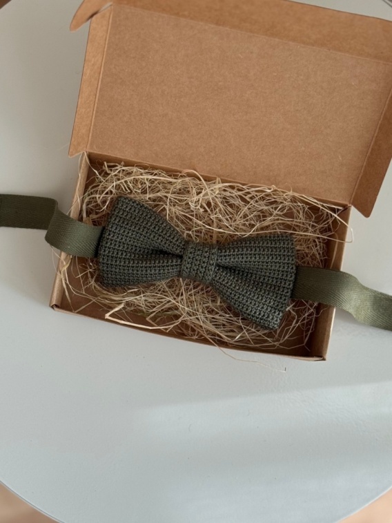 Ręcznie szydełkowana muszka z bawełnianego kordonka w zielonym/khaki to elegancki dodatek dla dziecka. Staranny splot, regulowany pasek i bezpieczne zapięcie (metalowe lub na rzep) zapewniają wygodę noszenia. Pakowana w ekologiczne pudełko.
