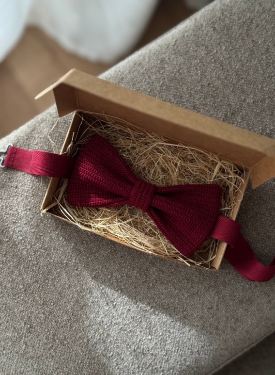 Ręcznie szydełkowana muszka z bawełnianego kordonka w kolorze bordowym to elegancki dodatek z naturalnych materiałów. Staranny splot, regulowany pasek i solidne metalowe zapięcie zapewniają wygodę noszenia. Pakowana w ekologiczne pudełko — idealna na prezent.