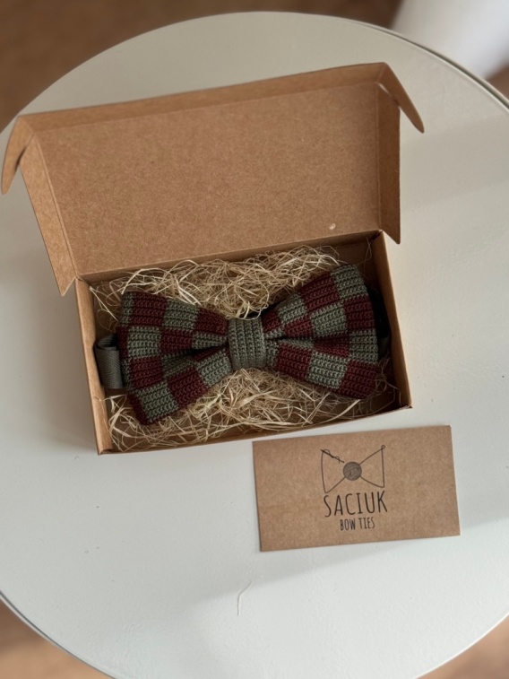 Ręcznie szydełkowana muszka z bawełnianego kordonka w brązowo-zieloną kratę to stylowy dodatek z naturalnych materiałów. Staranny splot, regulowany pasek i solidne metalowe zapięcie zapewniają komfort noszenia. Pakowana w ekologiczne pudełko — idealna na prezent.