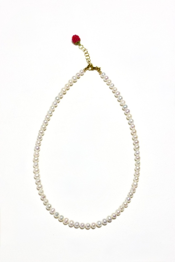 Naszyjnik Klasyczne Perły to ponadczasowa elegancja z figlarnym akcentem. Minimalistyczną formę przełamuje ręcznie wykonana malinka przy zapięciu — subtelny detal dla tych, którzy kochają klasykę, ale nie boją się odrobiny owocowego szaleństwa.