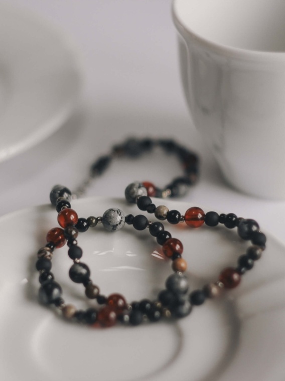 Naszyjnik koralikowy Arabica 40 cm unisex w odcieniach czerni i brązu inspirowanych kawą. Obsydian śnieżny, bursztyn, rodonit, piryt i szkło tworzą głęboką, elegancką kompozycję. Zapięcie ze stali chirurgicznej.