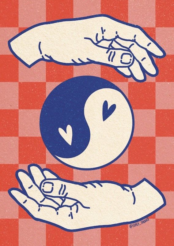 Plakat 30 x 40 cm z motywem dłoni otaczających symbol yin i yang z sercami symbolizuje równowagę, bliskość i harmonię. Retro-minimalistyczna forma oraz ciepła kolorystyka dodają wnętrzu przytulności i pozytywnej energii. Druk na papierze min. 200 gsm. Wysyłany bez ramy.