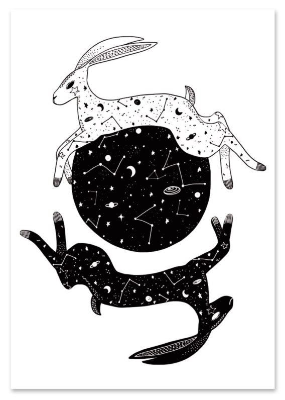 PLAKAT KOSMICZNE ZAJĄCE to minimalistyczny czarno‑biały plakat w stylu skandynawskim. Elegancka i nowoczesna dekoracja wnętrza. Druk na papierze premium 250 g. Plakat sprzedawany bez ramy, bezpiecznie pakowany w tubę.