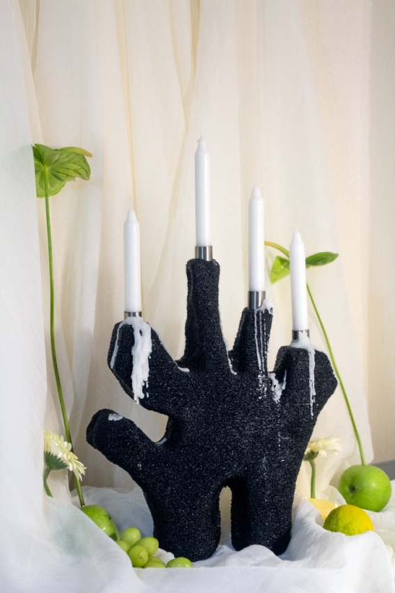 Każdy element operuje światłem w innej skali - płomień świecy wydobywa strukturę, podkreśla głębię i nieregularność formy, nadając jej zmienny, żywy wymiar. To przedmioty użytkowe, które funkcjonują na granicy rzeźby i codziennego doświadczenia.