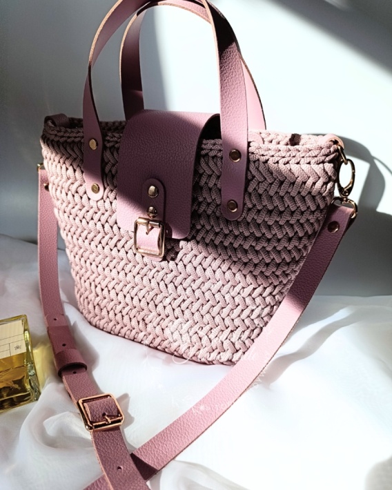 Ten ręcznie wykonany koszyk to połączenie lekkości, pojemności i wyjątkowego stylu. Szydełkowany z najwyższą starannością, z dodatkiem skórzanych elementów, zachwyca dopracowaną formą i kobiecym charakterem.