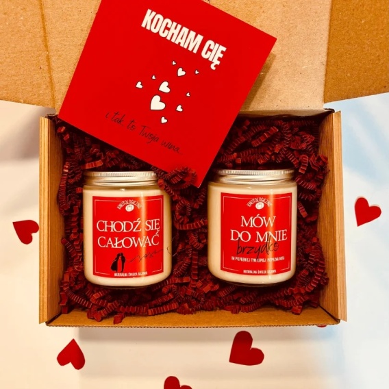 Zestaw randkowy dla dwojga 💘 - świece, gry i pikantna kartka ✨ Świeca „Chodź się całować" - jaśmin i drzewo sandałowe, czysty afrodyzjak ✨ Świeca „Mów do mnie brzydko" - pikantny pieprz, rozgrzewa atmosferę 💌 Niegrzeczna kartka z kuponami na przyjemności dla dwojga 🎲 Kości miłości w czerwonym welurowym woreczku - zabawa i śmiech 🎁 Eleganckie pudełko z czerwoną wstążką - gotowe do wręczenia